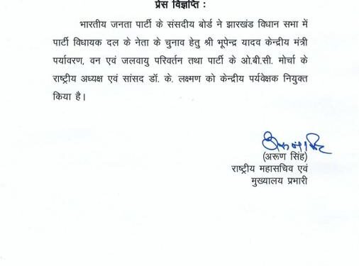 केंद्रीय मंत्री भूपेंद्र यादव और ओबीसी मोर्चा के राष्ट्रीय अध्यक्ष और संसद के लक्ष्मण को पार्टी ने पर्यवेक्षक नियुक्त किया है.भाजपा विधायक दल का जो नेता होगा वही झारखंड विधानसभा का नेता प्रतिपक्ष होगा.विधायक दल का नेता पद के लिए भाजपा के प्रदेश अध्यक्ष बाबूलाल मरांडी प्रबल दावेदार हैं.इसके बाद चंदेश्वर प्रसाद सिंह, नवीन जायसवाल और चंपाई सोरेन के नाम की भी चर्चा है.