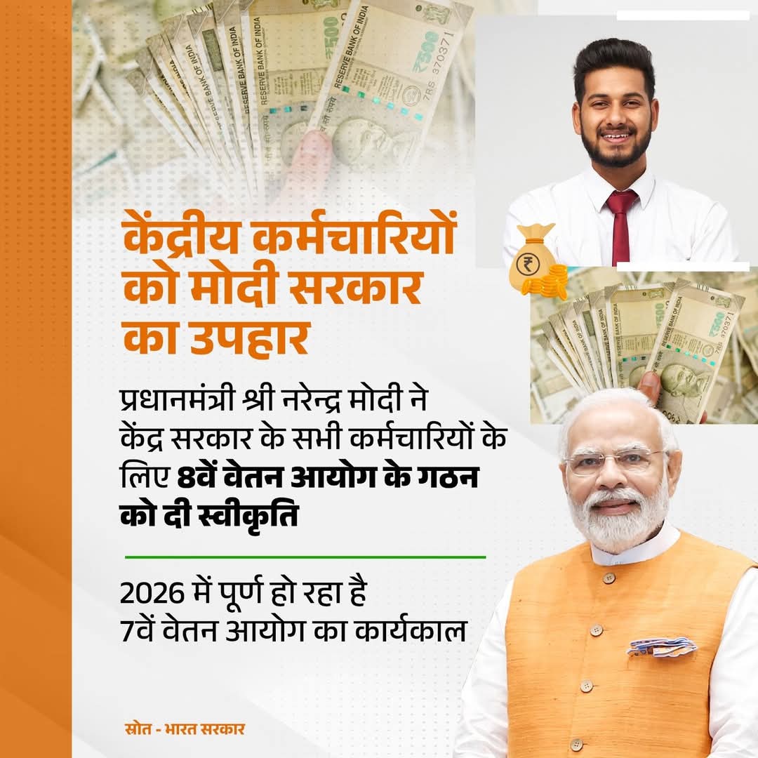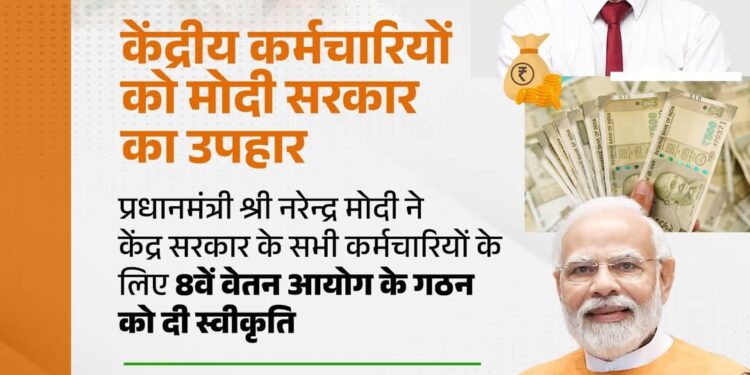 नई दिल्ली: केंद्र की मोदी सरकार ने केंद्रीय अधिकारी और कर्मचारियों के लिए बड़ी घोषणा की है. इसका इंतजार काफी समय से किया जा रहा था. केंद्र सरकार ने उनकी मुरादें पूरी पर दी है. आठवां वेतन आयोग के गठन को मंजूरी दे दी गई है. केंद्रीय कैबिनेट ने आज गुरुवार को हुई बैठक में इसके गठन के प्रस्ताव को मंजूरी दी. प्रधानमंत्री नरेंद्र मोदी के नेतृत्व में हुई इस बैठक में कैबिनेट के अन्य सदस्य मौजूद थे.